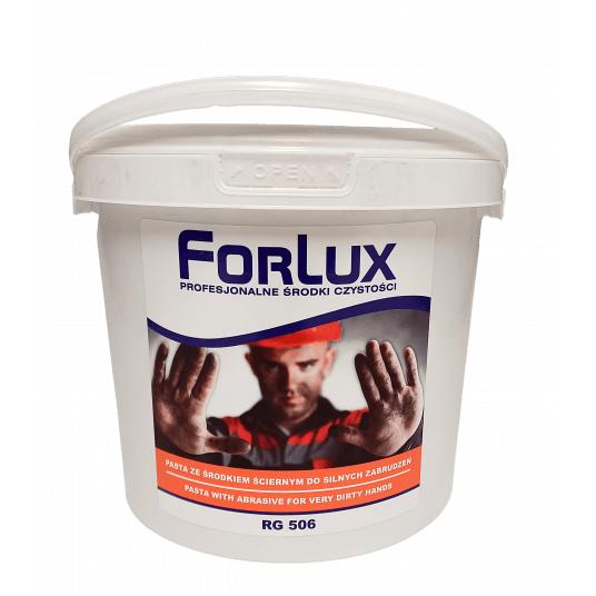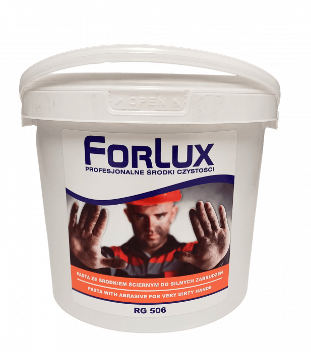 Pasta Forlux RG 506/W (wiaderko) do gruntownego mycia rąk ze środkiem ściernym. Skutecznie usuwa nawet uporczywe zabrudzenia typu: olej, smar, tłuszcz, sadza, pozostałości z farb. Dzięki substancjom ścierającym oraz neutralnemu współczynnikowi pH nadaje się także do częstego mycia rąk. Zawarte w niej składniki natłuszczające chronią dłonie przed nadmiernym wysuszaniem skóry. Doskonale sprawdza się do mycia rak w warsztatach, zakładach przemysłowych oraz rolnictwie.