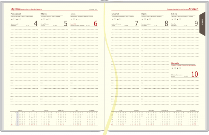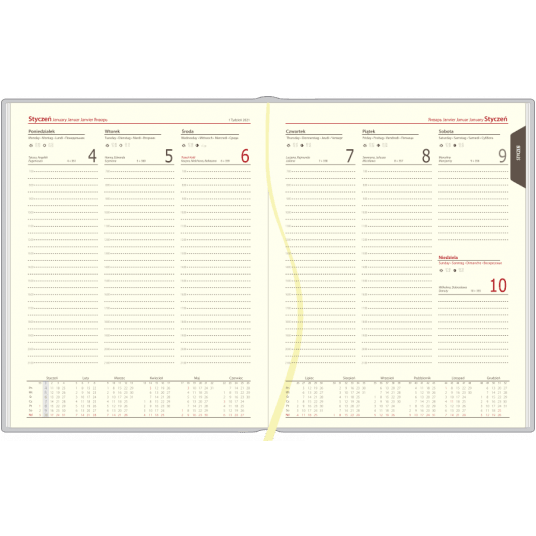 | Układ: | tygodniowy, 1 tydzień na 2 stronach (cały tydzień na rozkładówce) |